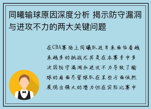 在CBA赛场上,同曦队近年来面临着越来越多的挑战,尤其是在本赛季中,多次因防守漏洞和进攻不力导致了输球的局面。尽管球队在某些方面依然展现出强大的潜力,但在实际比赛中,他们的不足之处却暴露无遗。通过对同曦队本赛季表现的深入分析,可以归纳出两个主要问题:防守漏洞和进攻不力,本文将从这两大问题入手,对同曦队的输球原因进行深度剖析,并提出相应的解决思路。本文将从四个方面对其进行全面解析:一是防守端的松懈与缺陷,二是进攻端的效率低下,三是球员个人能力的发挥不足,四是球队整体配合的不足。每个方面将进行详细探讨,力求为同曦队未来的调整和优化提供有价值的建议。